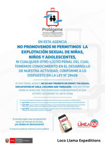 En el caso de agencias de viajes y operadores turísticos, como loco llama expeditions, nos comprometemos a este compromiso al firmar el Código de Conducta contra la ESNNA ante GERCETUR. Nos comprometemos a cumplir con los principios y responsabilidades establecidos en este documento, así como a acatar la Ley General de Turismo y sus regulaciones relacionadas con la prevención de la ESNNA.